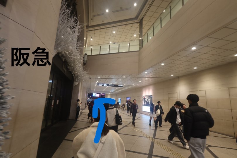 左側にはタリーズ、阪神梅田の駅、ヒルトンプラザ、右側はハービスです。